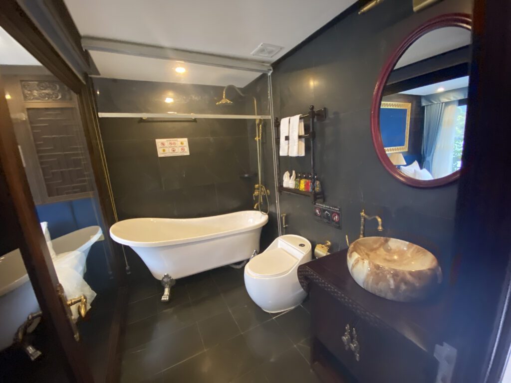 其實我們原本訂的是歐美頗受好評的五星級 Orchid 郵輪,不過臨行前接到郵輪公司來詢問是否願意接受升等(?)到懷舊號 Nostalgia Halong Cruise ,查了一下路線一樣都是偏向清幽避開觀光客的蘭哈灣行程,差別在於懷舊號是比較新的品牌,網路上評價不多但都很好,總共只有約十間客房的溫馨小船,客房都有私人陽台,我們搭的這艘基本上除了我們以外都是歐洲白人,有天晚上還跟所有其他旅客一起穿房間附的傳統服飾,非常溫馨有趣。
