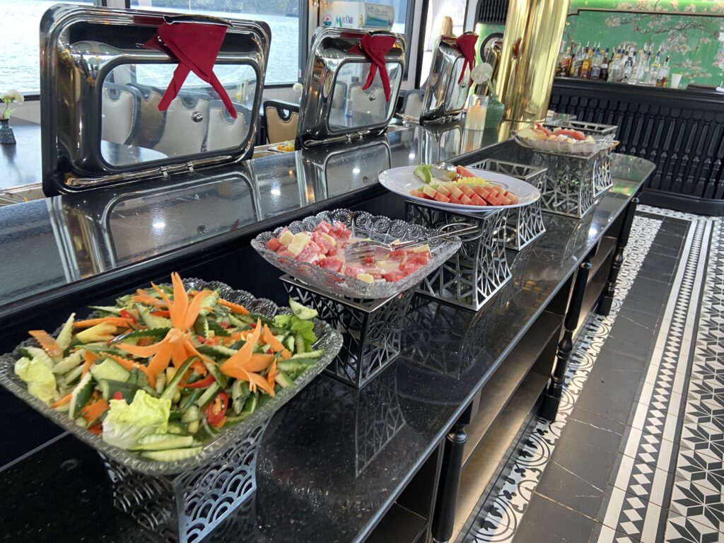 - 餐飲:不論是早餐午餐的 buffet 還是主菜式的晚餐我覺得都有一定水準,菜色主要也是以越式搭歐式為主,例如會有歐洲人習慣的一些火腿冷菜起司,另一邊則是越南風情的炸春捲、豆腐及其他相關菜餚;主菜式的晚餐則有三種類型的主菜(魚、牛排、越式海鮮飯) 可選,味道都蠻不錯,前菜還有羹湯和炸春捲等,甚至還有上菜秀,原本上船前還怕船上吃不飽或吃不慣買了一些零食上來,殊不知真的每餐都吃到撐,完全沒有胃再吃其他零食了~