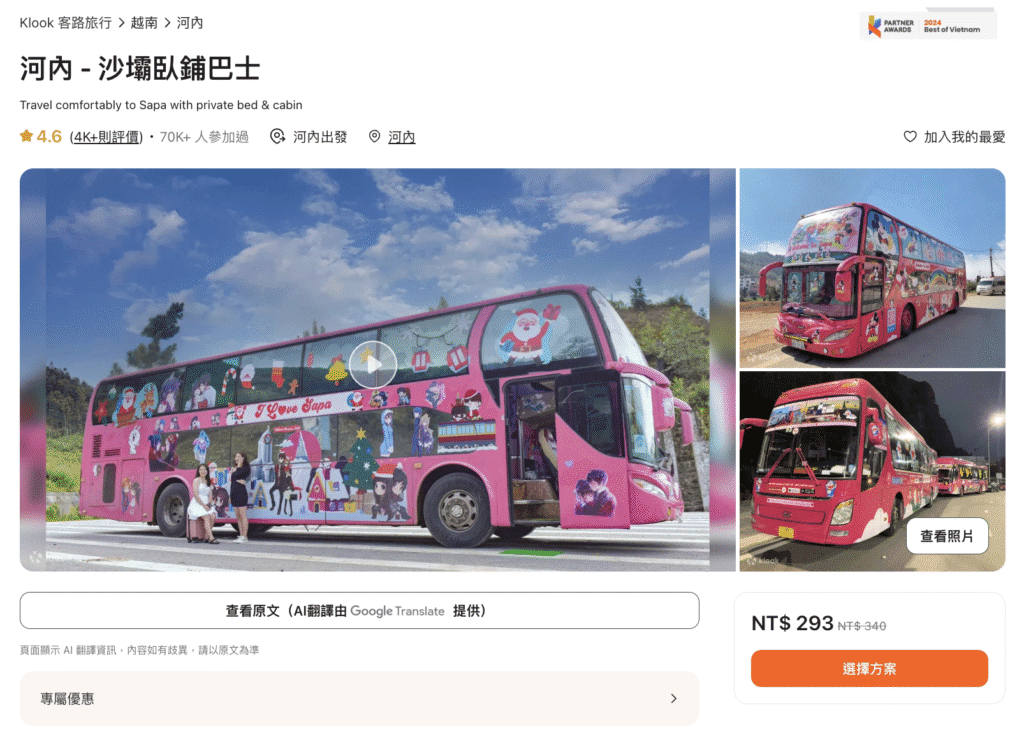 - 票價:依車種及搭乘人數不同,河內到沙壩單程 Klook / KKday 包車價格約落在台幣4000~8000元,可參考下表